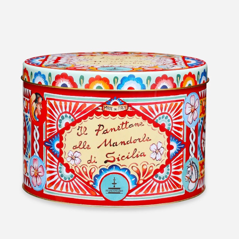 Artisan baked panettone with raisins and covered with icing, pearl sugar and Sicilian almonds. Hand wrapped in a Dolce & Gabbana designed tin and gift bag to match.
